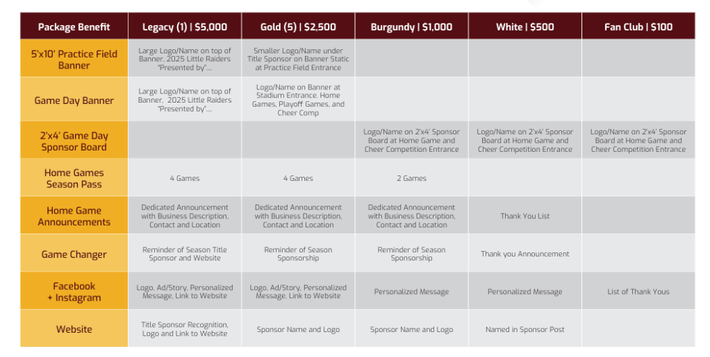 CHOOSE YOUR PARTNER PACKAGE AND CLICK THE LINK BELOW, TO MAKE A DIFFERENCE IN THE RAIDER COMMUNITY!